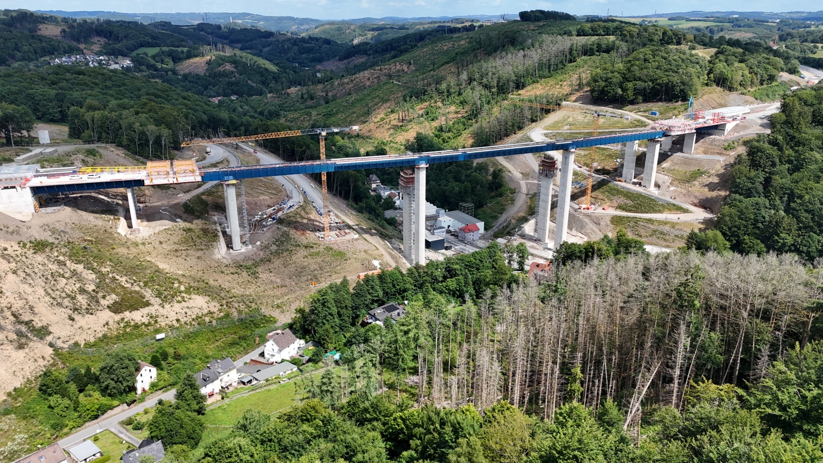 The complete demolition of Rahmede viaduct interrupted an essential section of the A45 highway in Germany. The replacement bridge, designed as a composite steel structure, was planned to be constructed using the incremental launching method within less than three years. In order to meet the demanding schedule, construction is progressing simultaneously from both abutments. Together with its consortium partners HABAU and Bickhardt Bau, MCE is raising the bar to meet the project requirements. Rahmede viaduct consists of a five-span composite steel structure with steel box girders and lateral cantilevers, completed with a reinforced concrete deck slab. The maximum span between the concrete piers is 108 m.