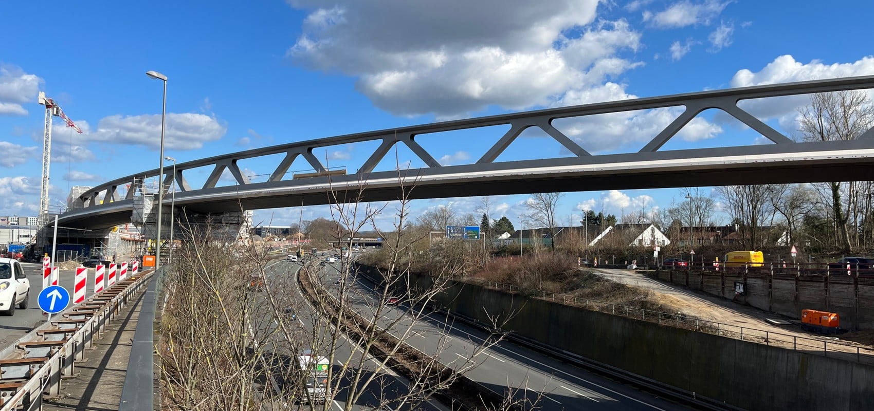 The bridge structure with a total length of 441 m was designed as a semi-integral structure, in which the superstructure is fixed into the two abutments and rests freely on the five intermediate pillars. In the bridge axis, a massive, centrally located truss girder provides the necessary sustainability; the roadways for the two tracks are arranged on both sides of the main girder. MCE developed a construction concept with a 40-meter-long launching nose, which allowed the bridge to span up to 81 meters without the originally planned auxiliary supports. In 2024, the first light rail train will roll over the bridge, offering passengers spectacular views of Düsseldorf Airport and the highways far below.