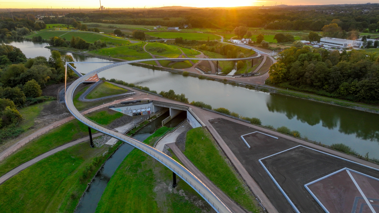 The s-shaped pedestrian and cyclist bridge across the oil harbour in Raunheim closes one of the last gaps in the network of cycle paths to the left of the river Main between Frankfurt and Mainz. The l-shaped geometry of the bridge does justice both to the safety requirements of the Frankfurt Airport large tank storage depot and to the visual connection from the superstructure over the Main into the surrounding nature